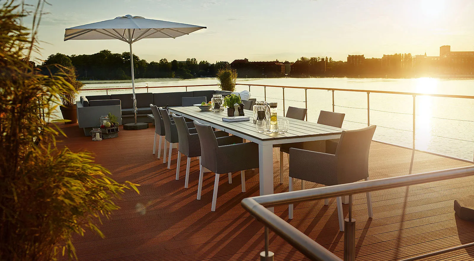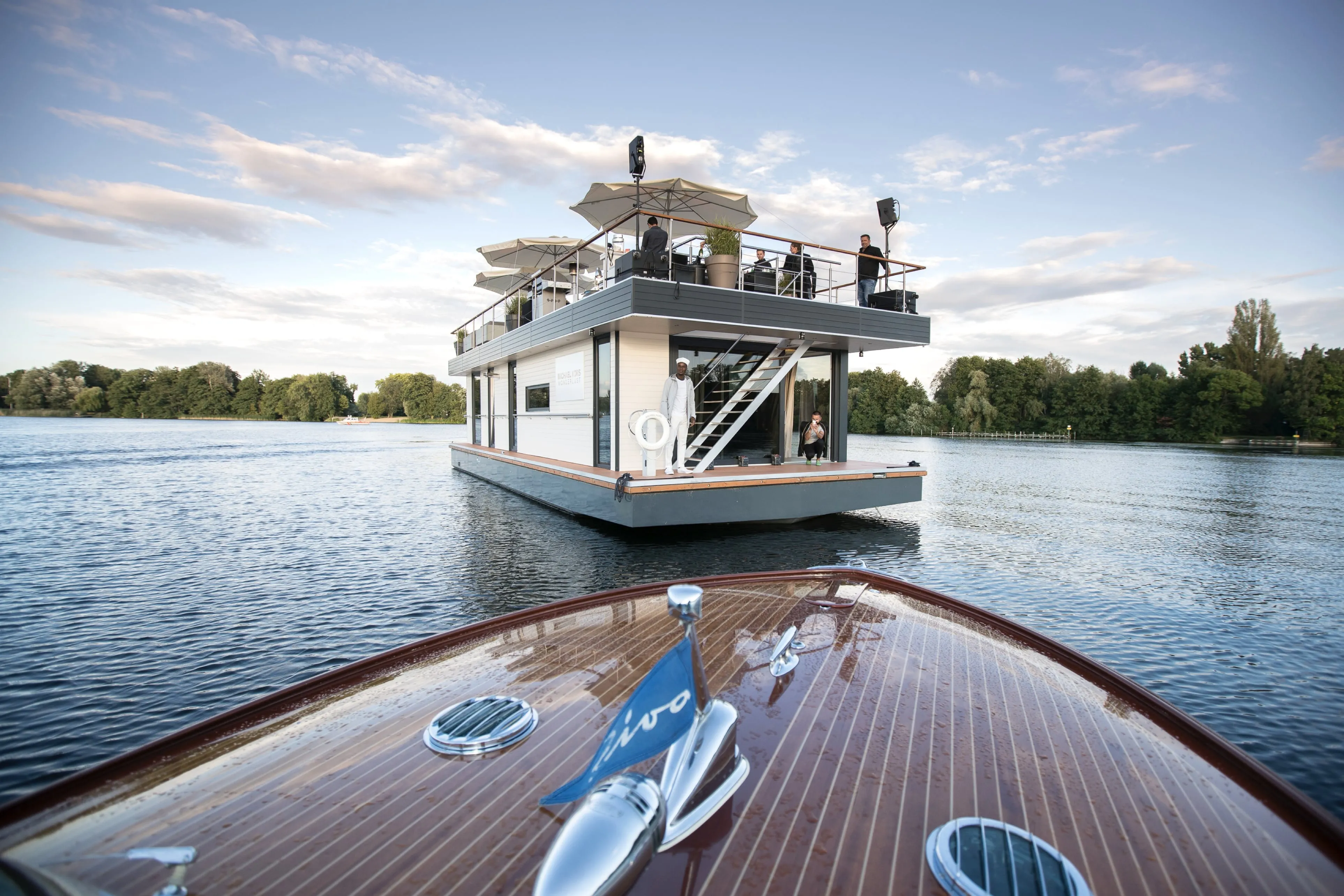 Existieren am Fluss oder See, mit Ihrem eigenen Ankerplatz, ständig wechselnder Umgebung und sicherem Panoramablick. Ein Highlight für Designliebhaber und die, die unbegrenzte Freiheit lieben. Denn ungehinderte Bewegung, klare Sicht und frei gestaltbare Innenräume sind gegeben. Der morgendliche Panoramablick ist einfach atemberaubend. Möchten Sie eine andere Sicht? Die weitläufige Sonnenterrasse ist stets einladend. Mit einem Motor öffnen sich die Wasserwege und Küsten Europas – ein Hochgenuss.