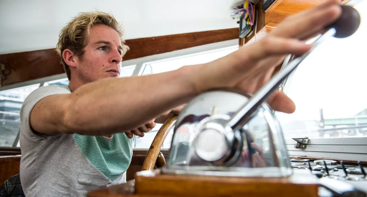 Daniel Rösner kneels on the stairs leading to the wheelhouse and fumbles a large piece of wood out of a ledge under the sitting area. Bob Marley dumbles through the boxes in the background. Daniel pushes a log of wood into the oven together with some crumpled pages from an old script. “The wood comes from my parents' farm. Whenever I'm there, I take a big bunch on board.” Pick up a match and the fire crackles. Cosy warmth spreads across the entire ship.