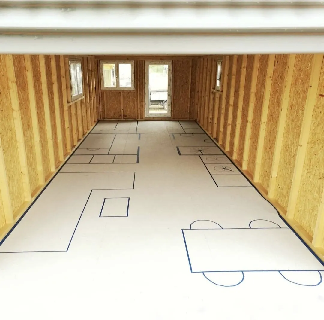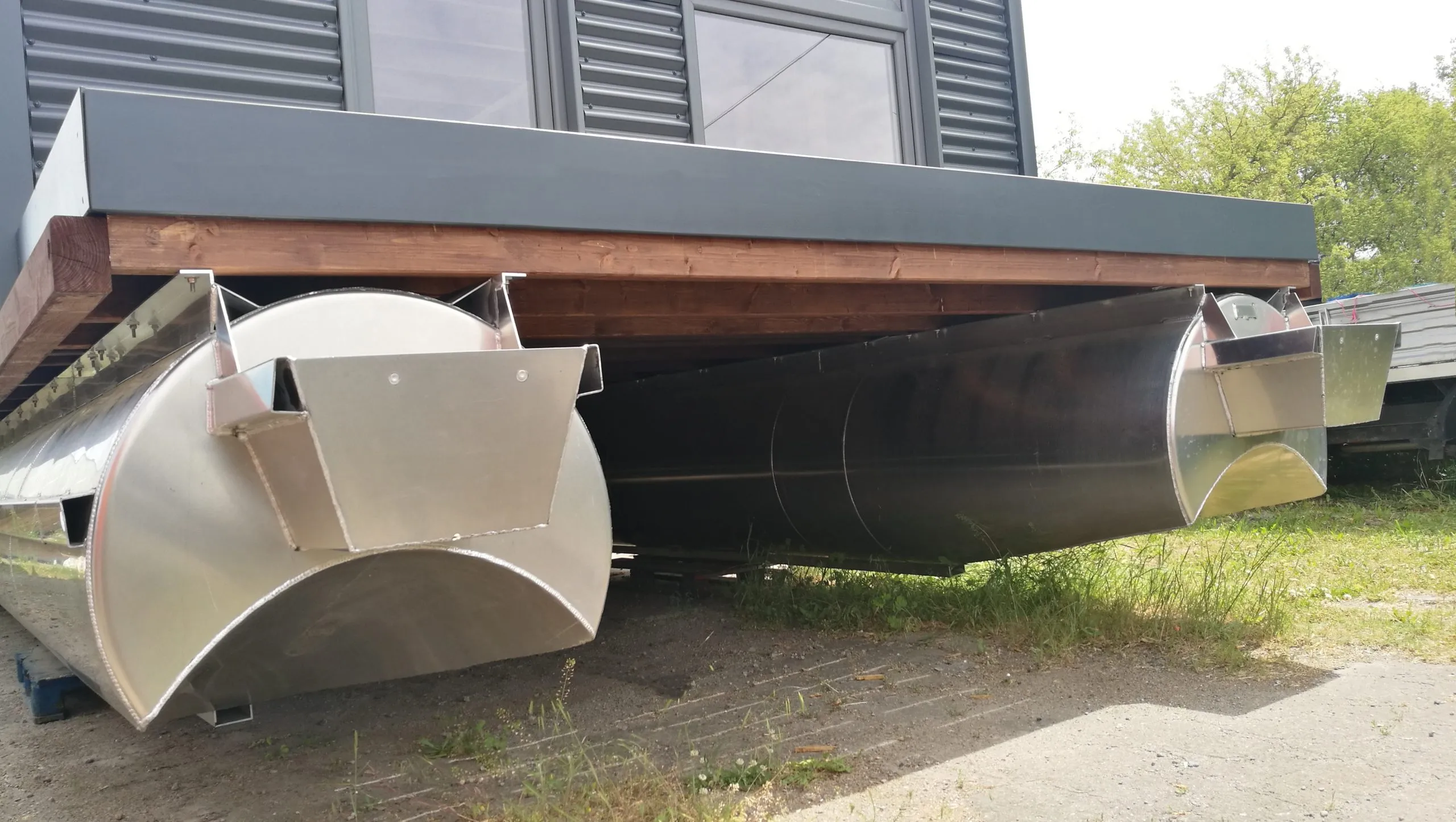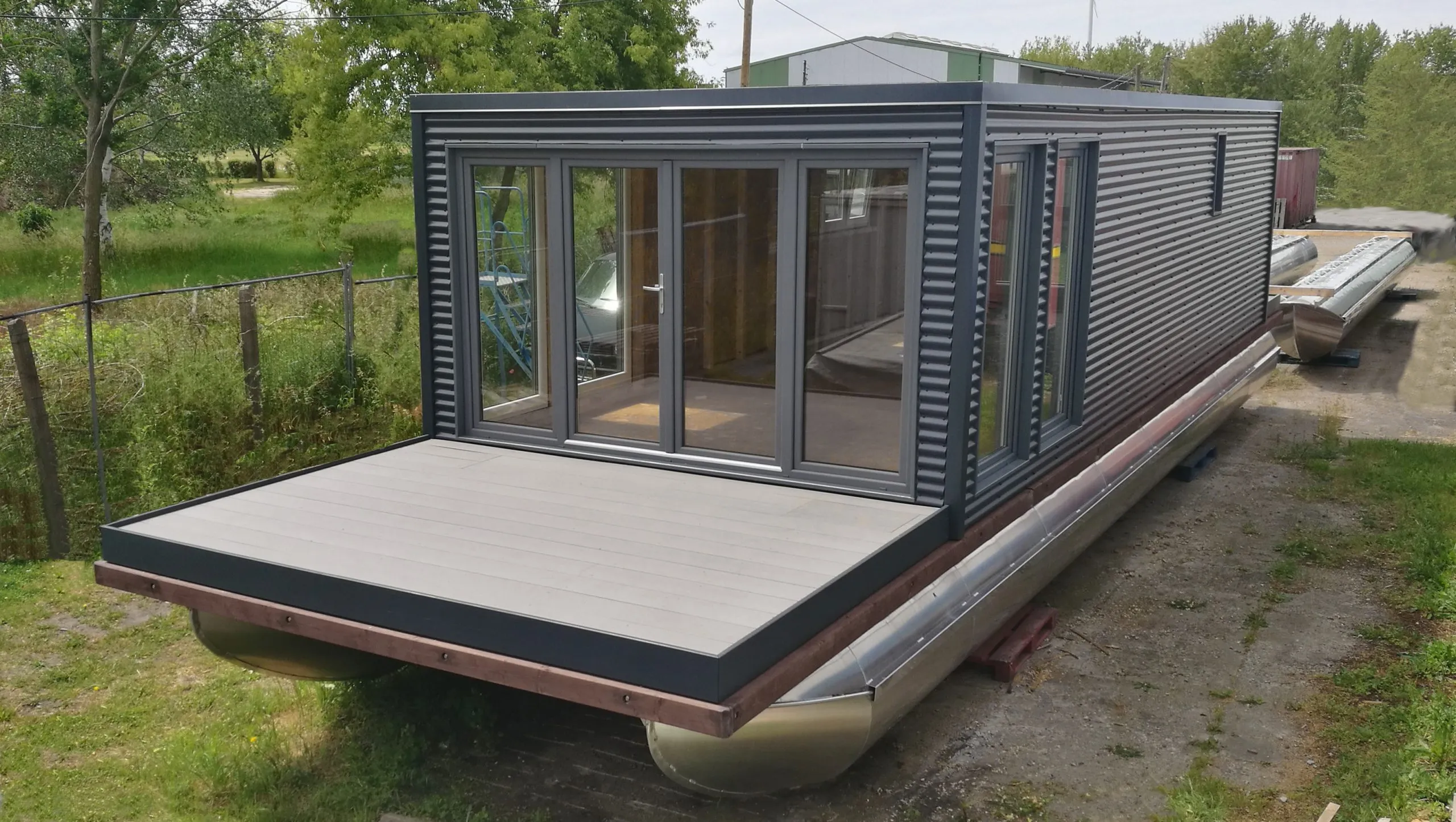 The blank is offered in the “closed shell” condition. That means it is completely waterproof. The roof is sealed, the windows and doors are installed and lockable. The terraces are finished and it is of course completely floatable.