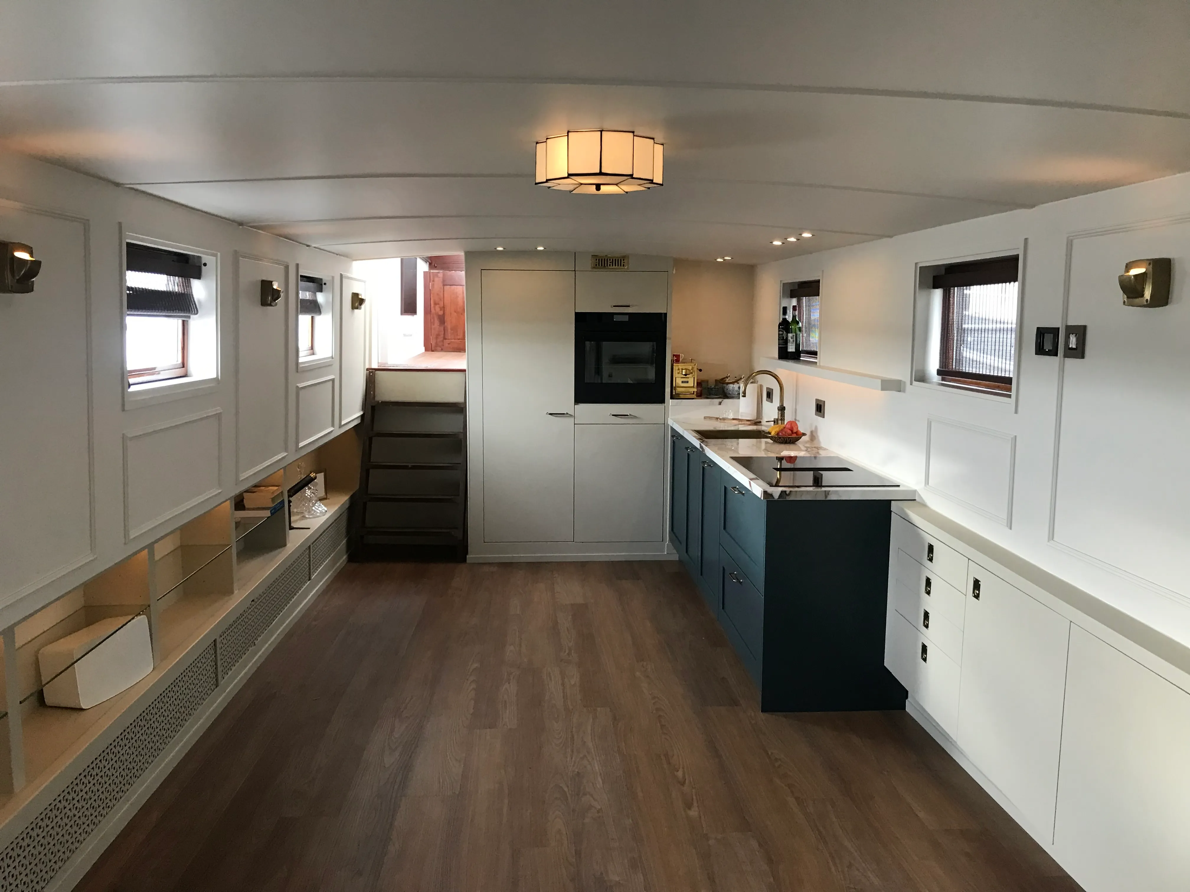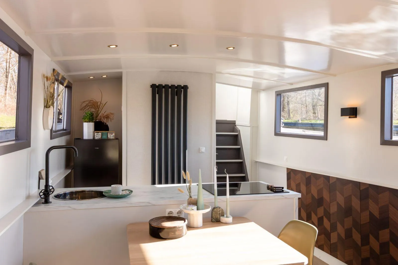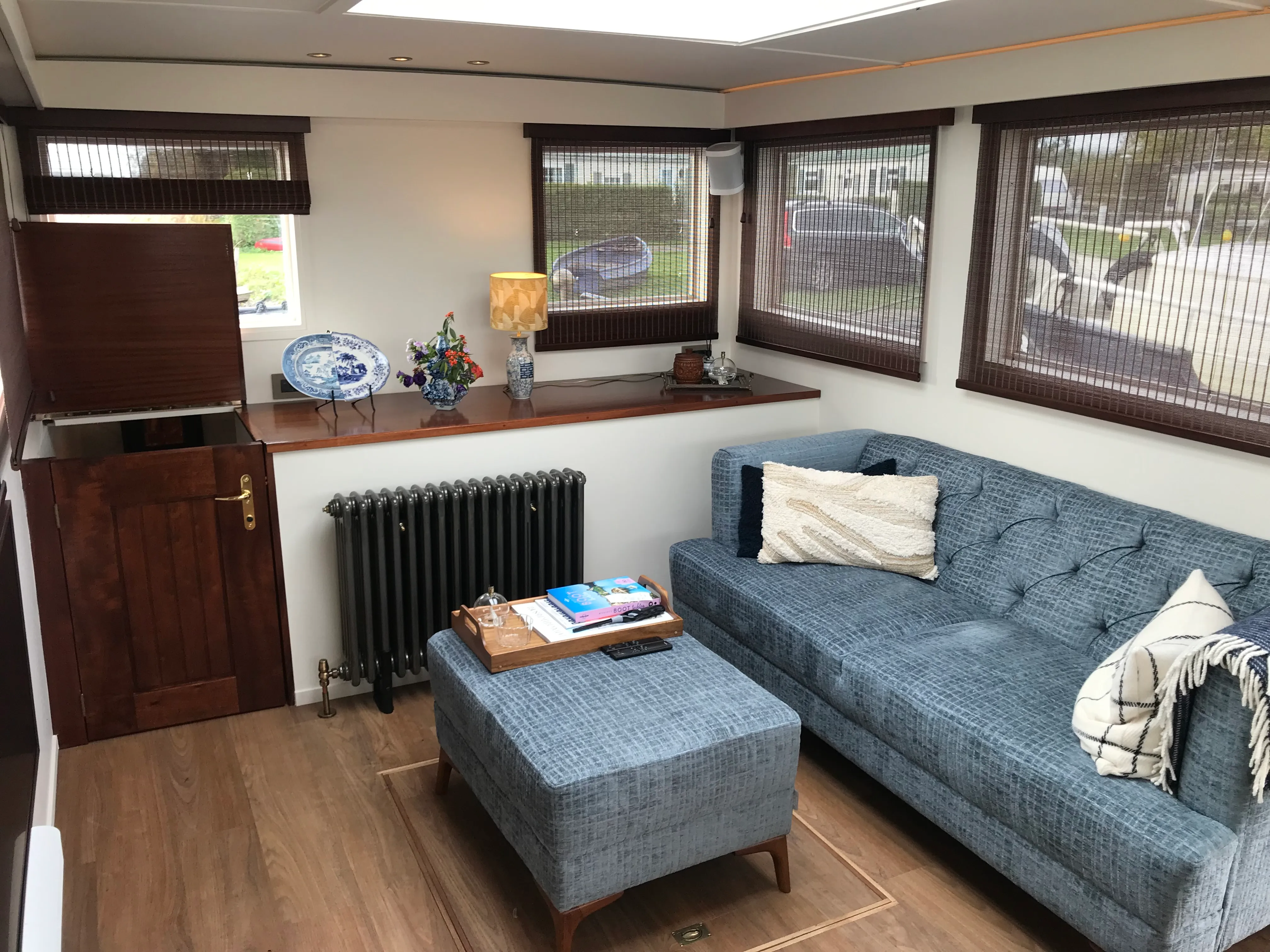 On board the yacht, you enter the covered outdoor lounge. This custom covered cockpit is a fantastic place to enjoy unique outdoor life on the water. The many large windows in the cockpit offer a real panoramic view. When you sit on the lounge sofas of your own houseboat, you won't want to return to an apartment in the city anytime soon...