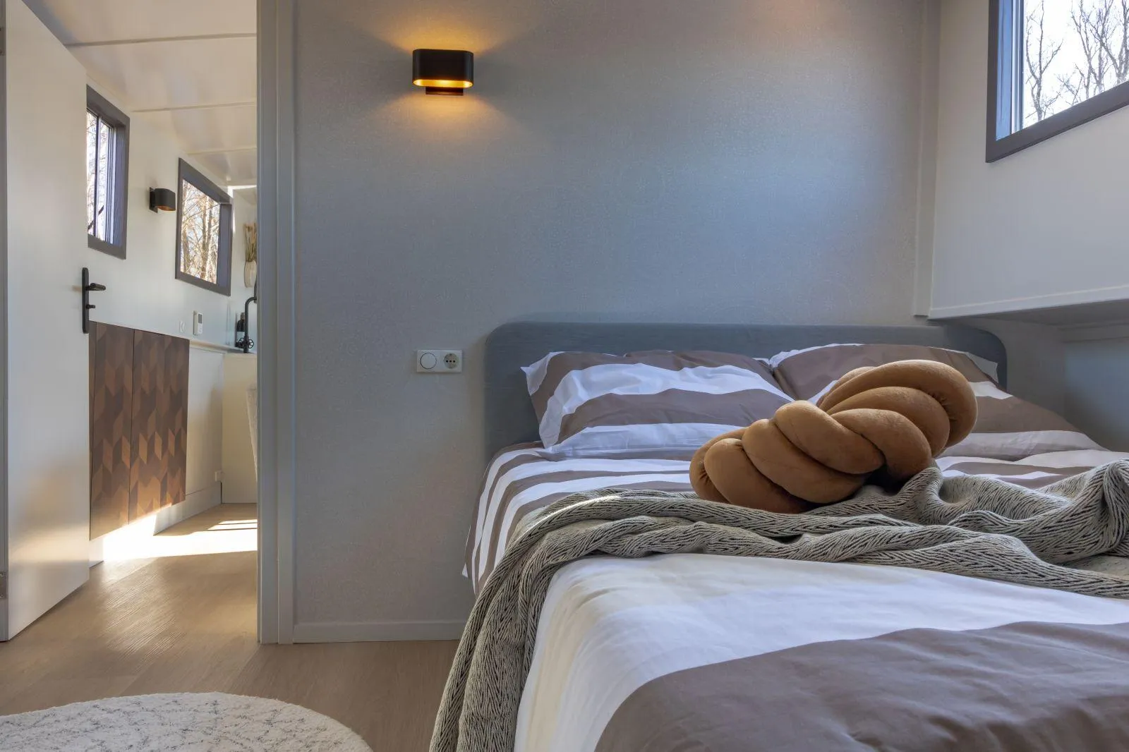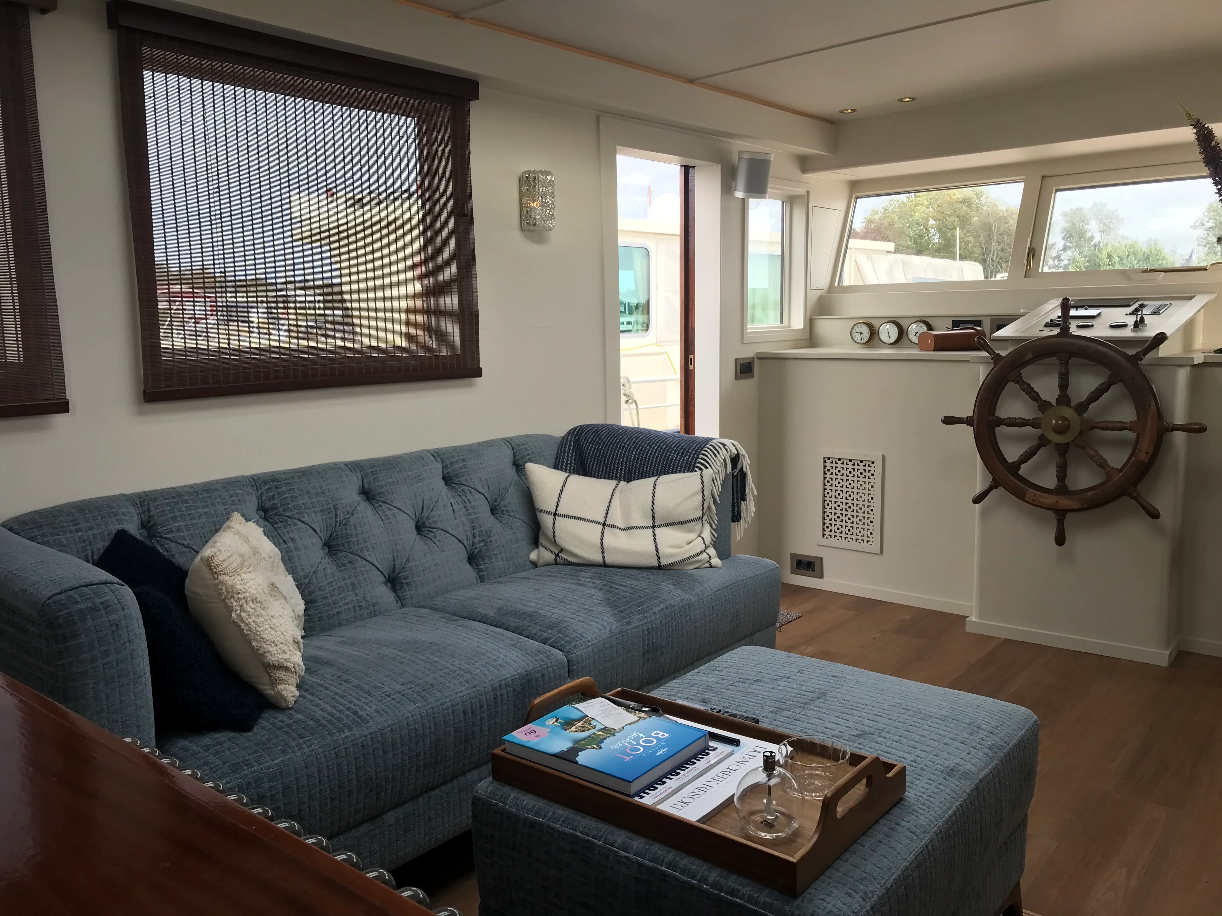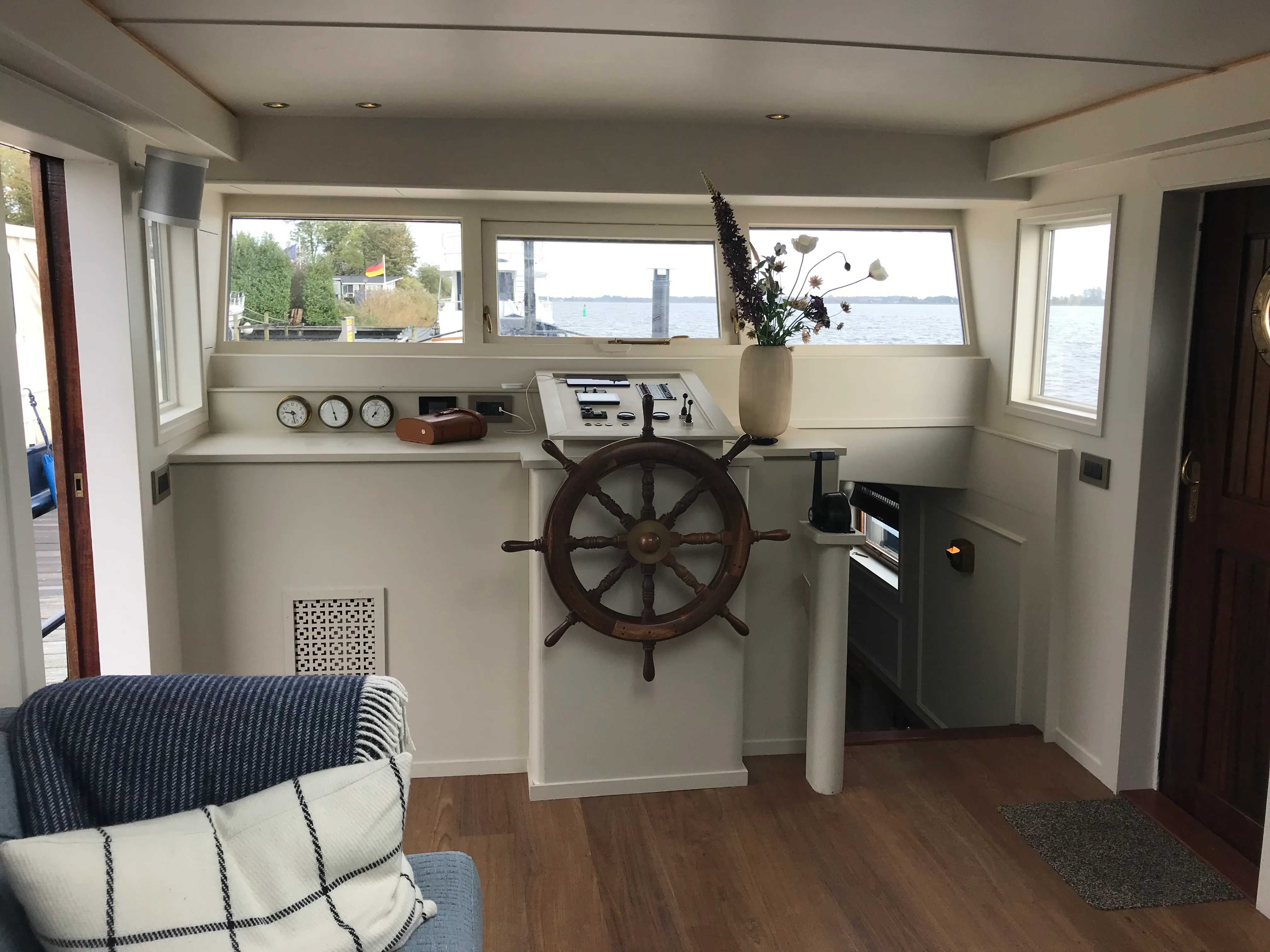 Two folding doors connect the cockpit to the wheelhouse. The wheelhouse is a great place to go on nice trips together. The many windows ensure good visibility when sailing. The large original steering wheel has been preserved and underlines the maritime flair.