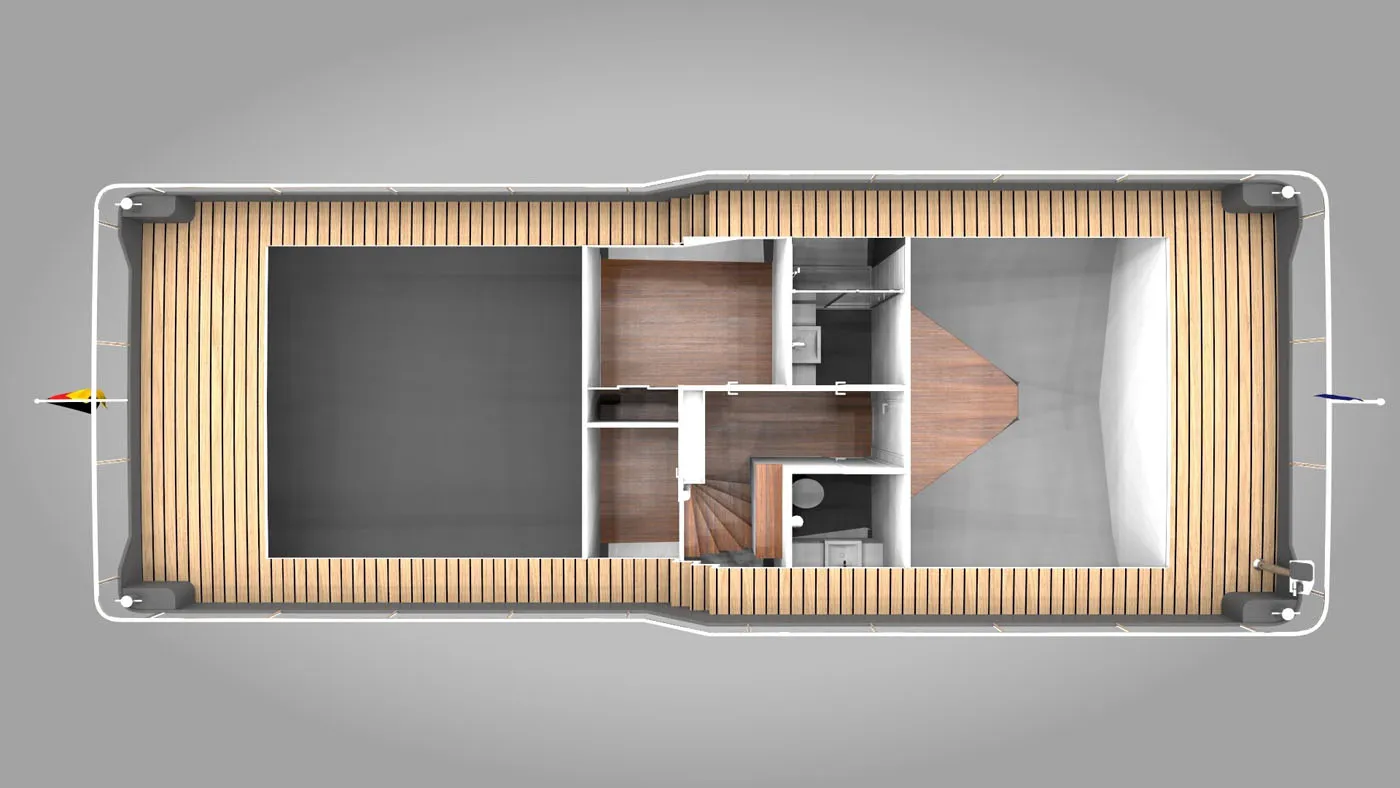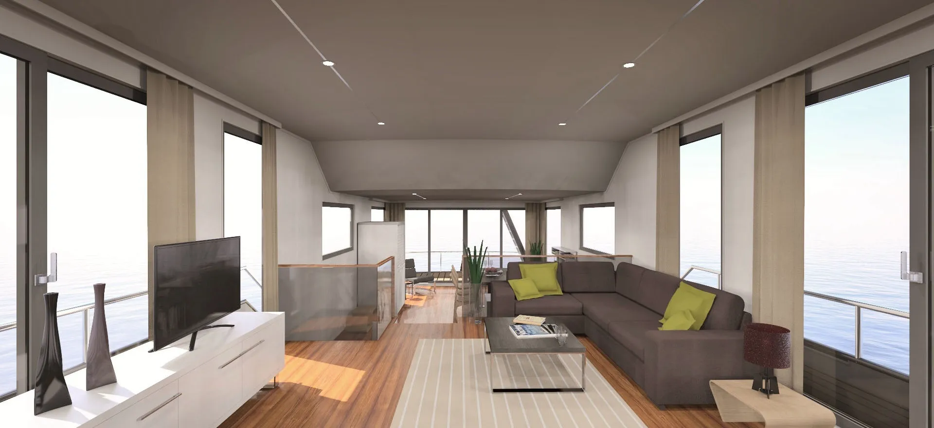 Due to the modular construction (steel body with flexible partitions), you can have your residential yacht converted for new purposes at any time, whether as a floating office, holiday apartment, showroom or event location.