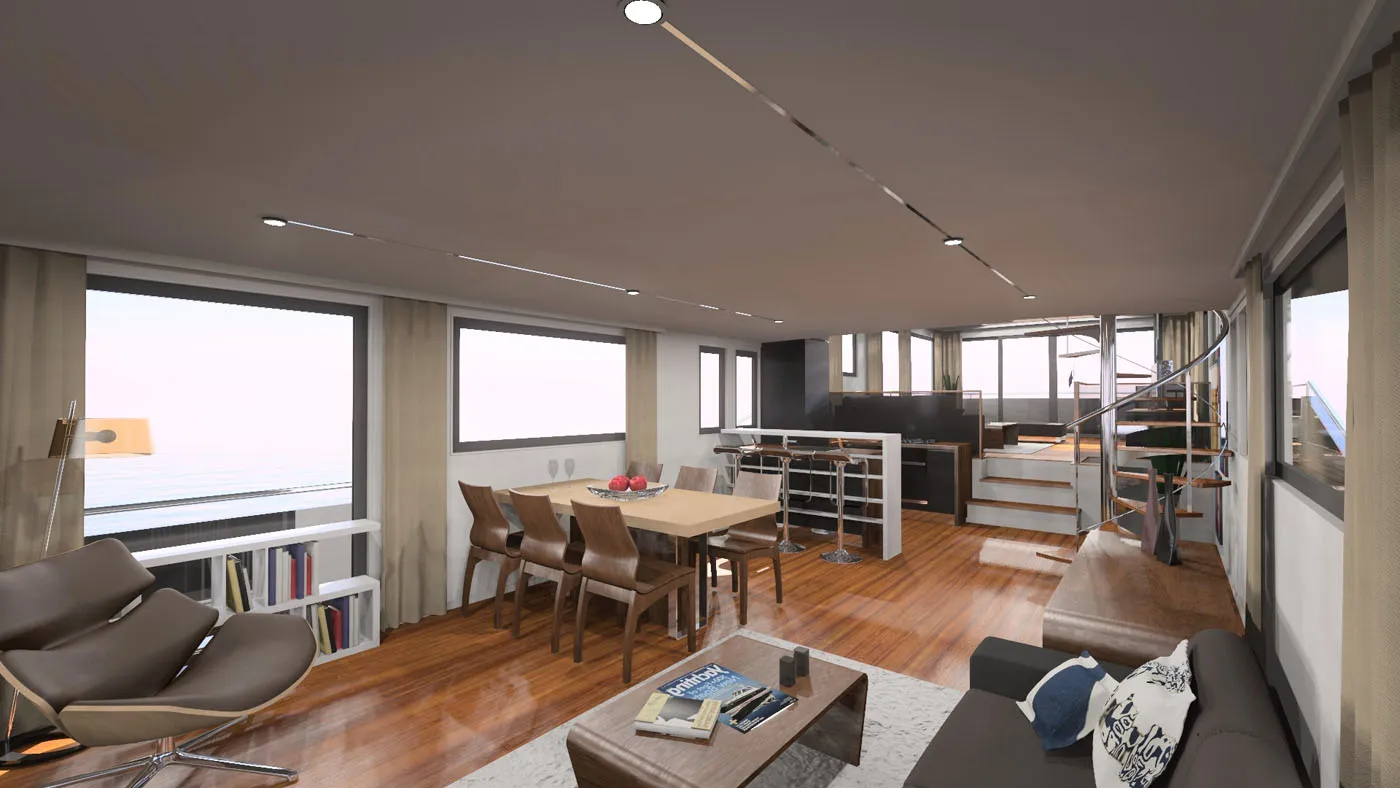 Due to the modular design (steel body with flexible dividers), you can Wohnyacht Have it converted at any time for new purposes, whether as a floating office, holiday home, showroom or event location.