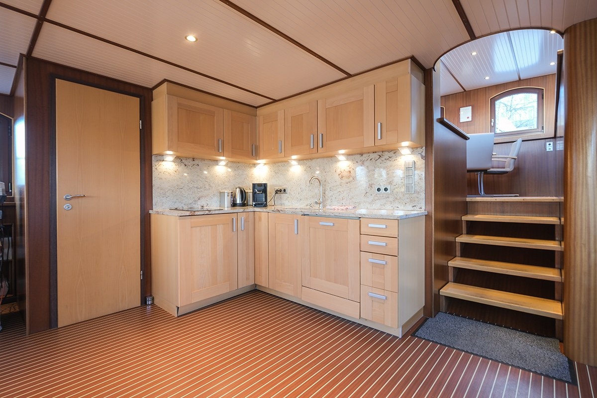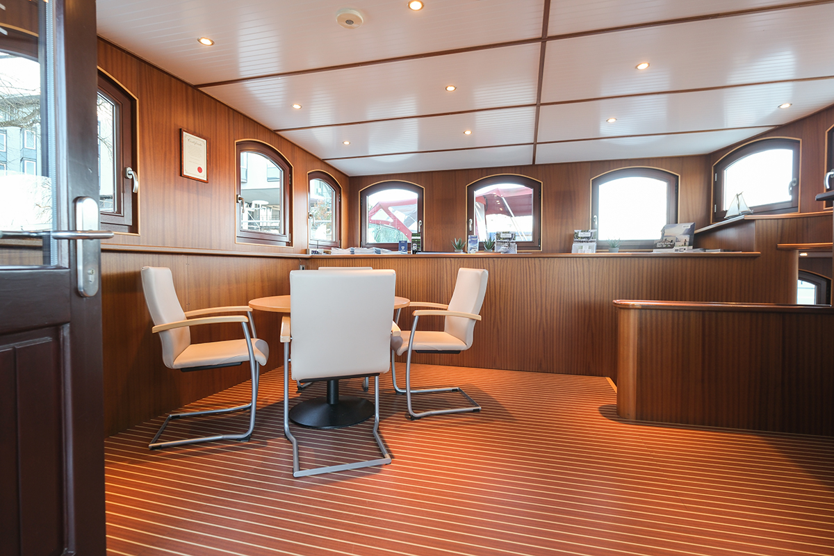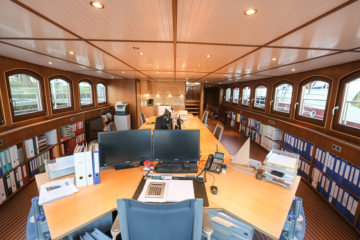 Mit einer Gesamtnutzfläche von ca. 85 mÇ bietet das Büroschiff großzügige und flexibel nutzbare Flächen. Die Achterkabine dient als separater Besprechungsraum, während der Hauptbereich ausreichend Platz für Büro-, Empfangs- oder Beratungsnutzung bietet. Küche und Badezimmer sind integriert und runden die Funktionalität dieses besonderen Objekts ab.